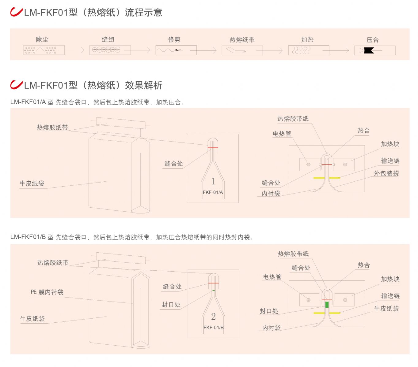 LM-FKF系列連續式縫包熱合封口機適用于聚酯編制袋、牛皮紙袋、多層紙袋或紙塑復合袋的封口包裝,該機可按編程自動完成包裝袋袋口的除塵、修剪、縫合、剪線辮、包紙帶、剪紙帶、熱封、壓合、計數等工序。經封口、縫合、包紙帶、熱壓的包裝袋密封性能極佳,可防塵、防蛀、防潮、防污染,使包裝物受到妥善的保護。